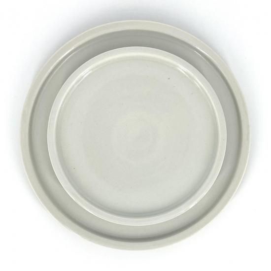 また、半磁器(陶器と磁器の中間の性質)で作られた器は取り扱いがしやすく、程よい重さもあり、安心感があります。和食洋食、ジャンルを問わず、どんなお料理も素敵に引き立ててくれます。何気ないけれども、とても美しい器は、レストランやカフェのように、何枚も揃えて使いたくなります。もちろんスタッキングも可能です。リムが細い分、たっぷりと盛り付ける事ができ、ワンプレートに最適。ハンバーグや海老フライなどちょっと嬉しいご馳走であったり、普段の家庭料理でも。ピザやホールケーキなど切り分けがとてもし易いです。