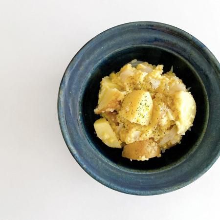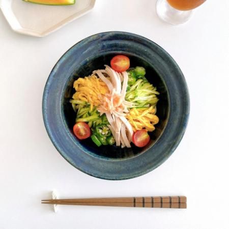 陶芸の町、栃木県益子町で作陶されている中村恵子さん。美しいインディゴは所々にグリーンが見え隠れし、奥行きの深さが感じられる色合いです。かぼちゃのスープやトマトソースのパスタ、グリーンサラダなど、どんな色のお料理も受け止めてくれる、中村さんのスープ鉢。毎日のおうちごはんに活躍してくれる、頼れる器です。