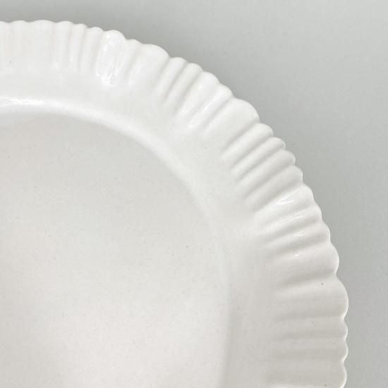 軽やかに波打つフリルに目を奪われる、しのぎフリル皿。やわらかな温もりを感じる白に上品なツヤが重なり、可憐さと落ち着きが美しく調和する一枚に。ふんわりと寄せたようなリムのフリルが、どんな料理も引き立て、食卓に華やぎを添えてくれます。(大)は、お肉やお魚のメイン料理はもちろん、パスタやワンプレートにも使いやすく、毎日の食卓で活躍してくれます。