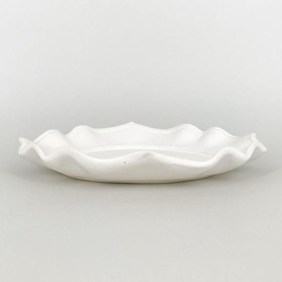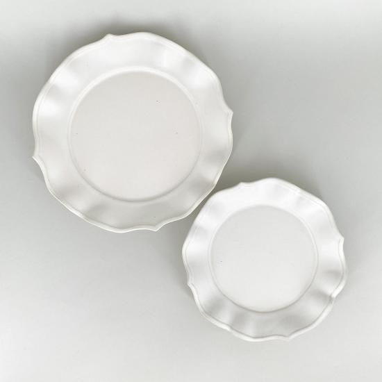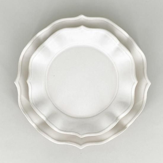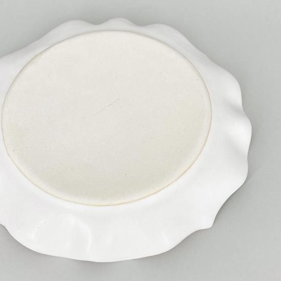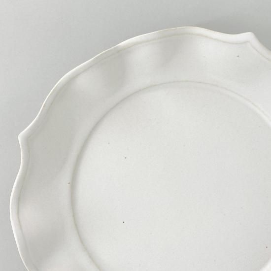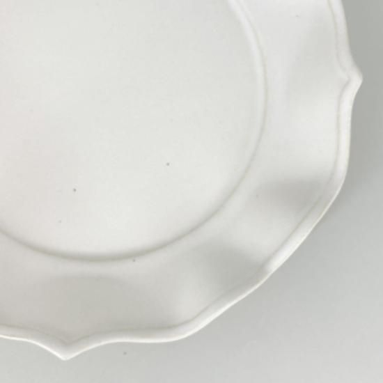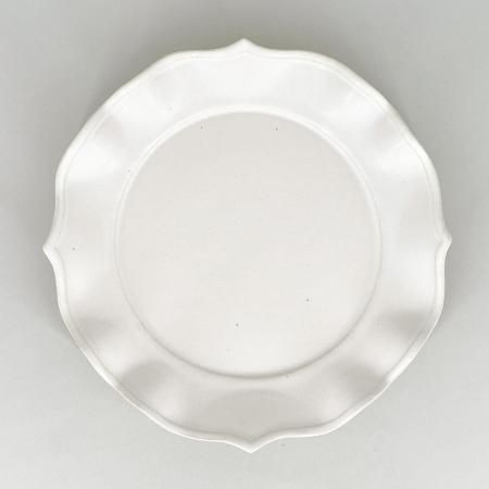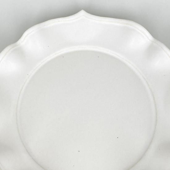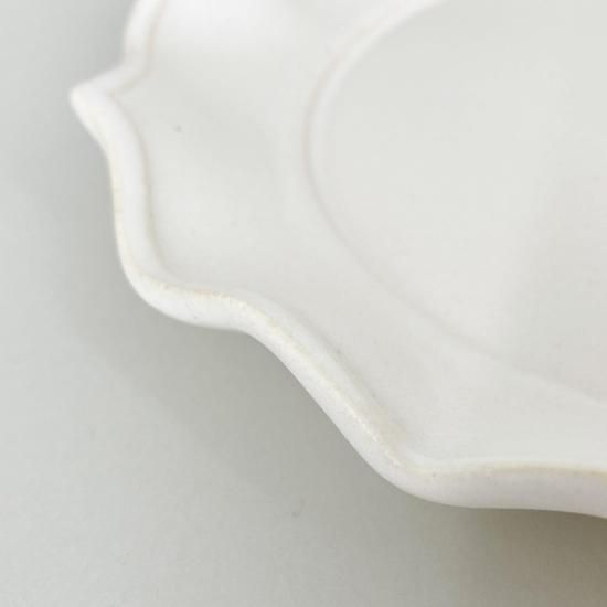 さらっとしたマットな質感が心地よい、フリル輪花皿。ゆるやかに流れるような動きのあるフリルが美しく、その佇まいは食卓にそっと華やかさを添えてくれます。ほどよい厚みと重さがあり、手にした時の安心感も魅力です。控えめな陰影と温かみのあるマットな白はどんな食材も美しく引き立て、メイン料理からデザートまで、幅広いシーンで活躍してくれる一枚です。
