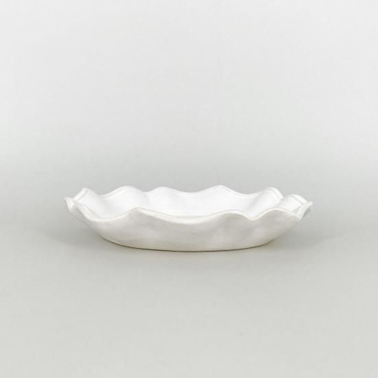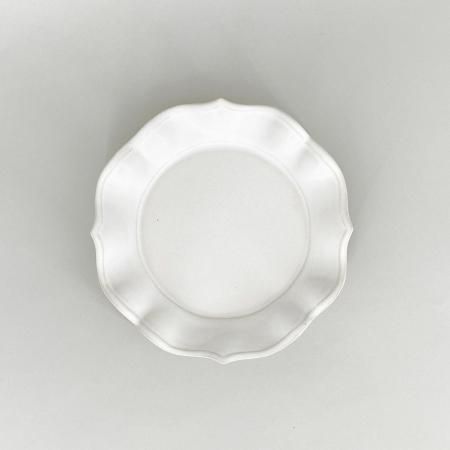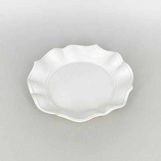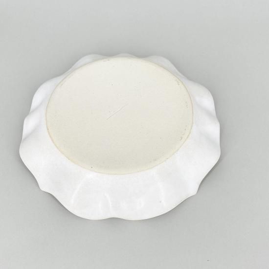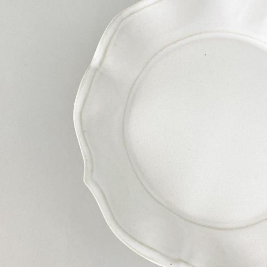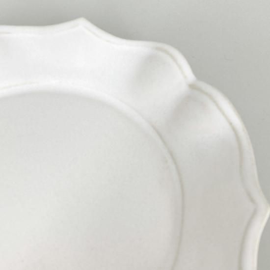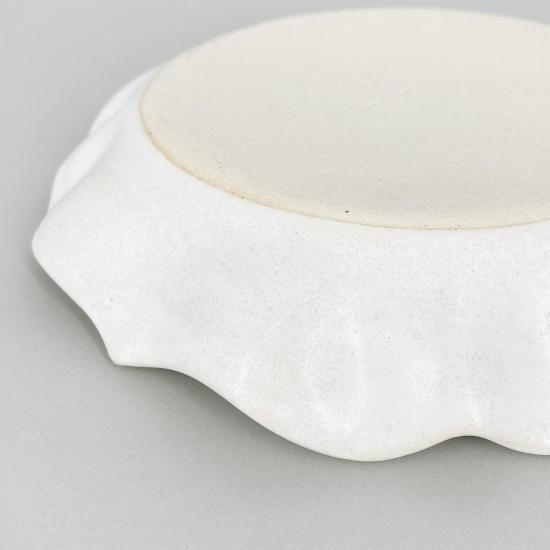 さらっとしたマットな質感が心地よい、フリル輪花皿。ゆるやかに流れるような動きのあるフリルが美しく、その佇まいは食卓にそっと華やかさを添えてくれます。ほどよい厚みと重さがあり、手にした時の安心感も魅力です。控えめな陰影と温かみのあるマットな白はどんな食材も美しく引き立て、サラダなどの副菜はもちろん、フルーツやデザートを盛り付けるのにもちょうど良い大きさです。