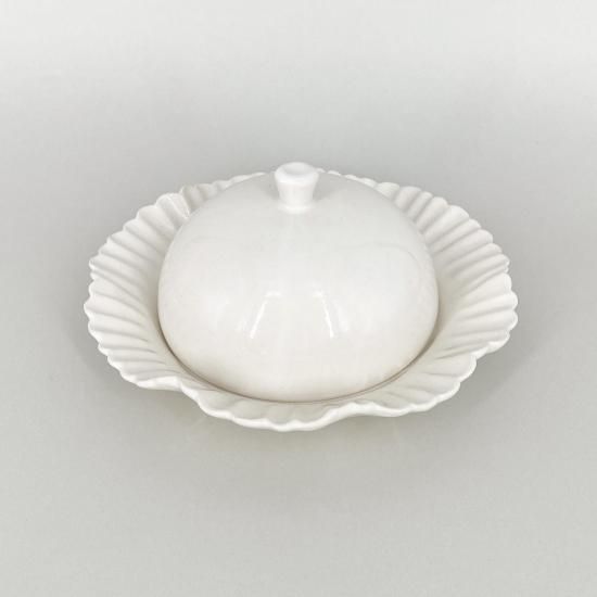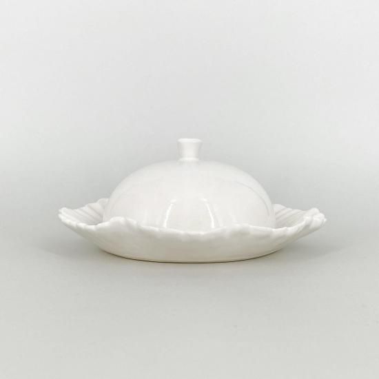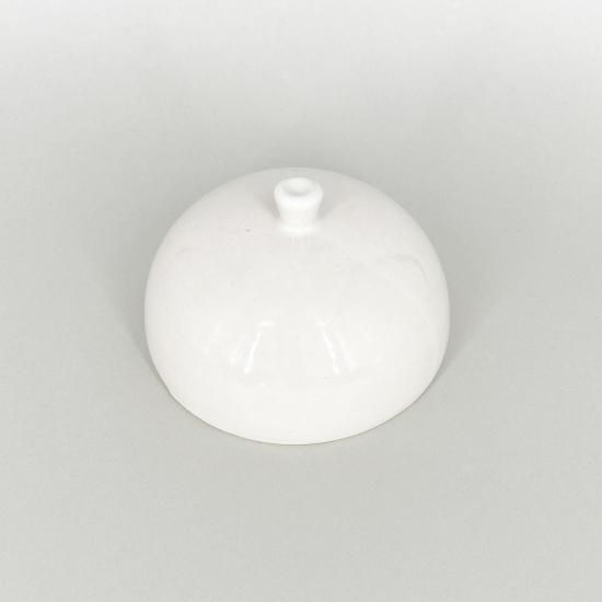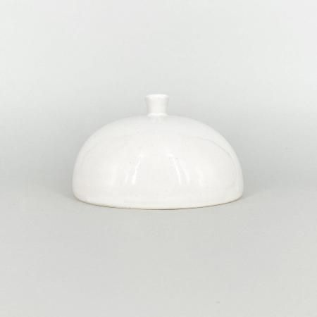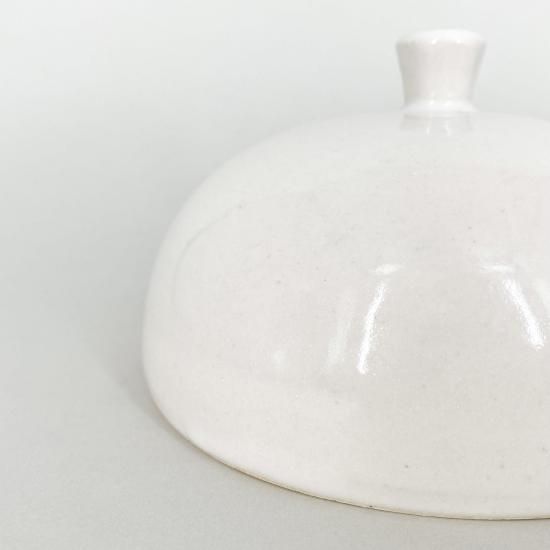 温かみのある白に落ち着いたツヤを纏った、凛とした佇まいのドームカバー。食卓にひとつあるだけで、ぐっと特別な雰囲気に。なめらかな曲線のフォルムは、機能とデザイン、そのどちらをも兼ね備えています。水谷さんのお皿なら、しのフリル(小)やフリル輪花(小)、ケーキスタンドにぴったりの大きさ。もちろん、サイズが合うお手持ちのお皿にもお使いいただけます。